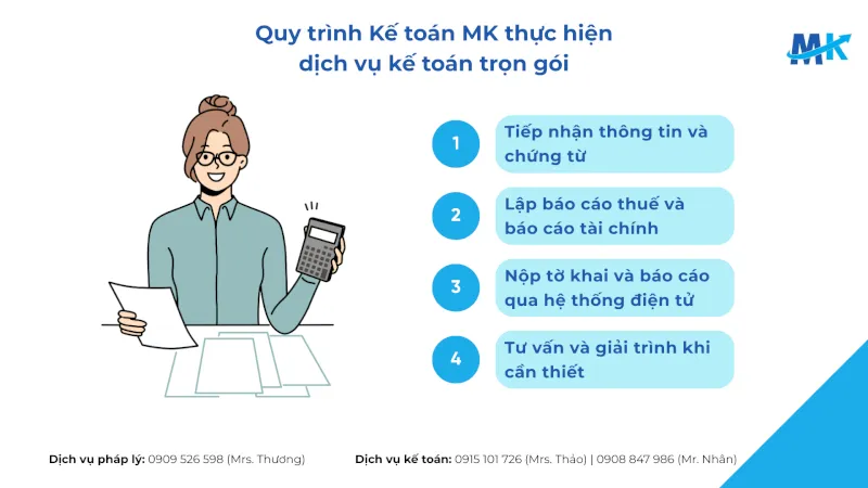 Dịch vụ báo cáo thuế trọn gói giá rẻ của Kế toán MK được triển khai theo quy trình 4 bước rõ ràng, đảm bảo tuân thủ quy định pháp luật và hỗ trợ tối đa cho doanh nghiệp: